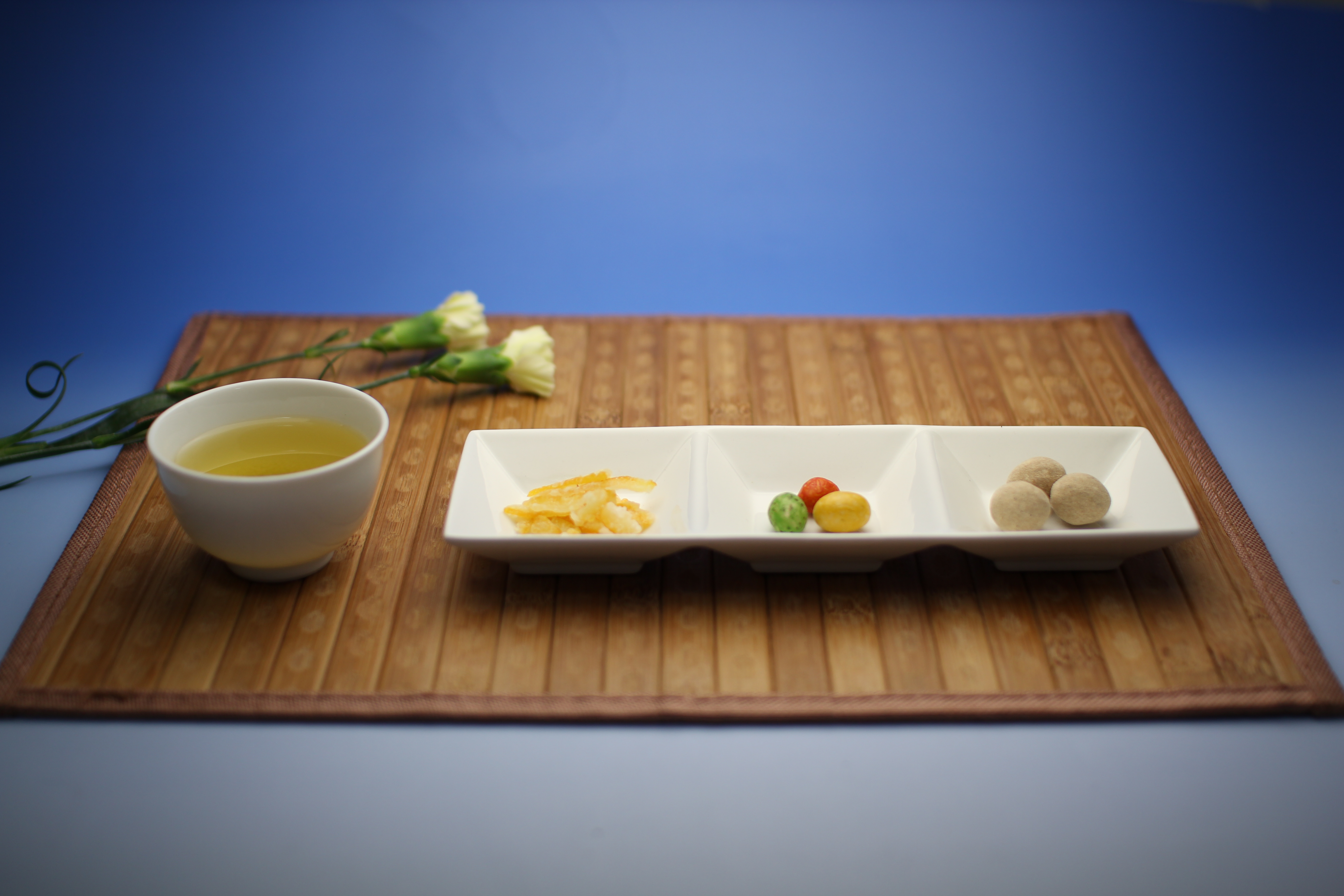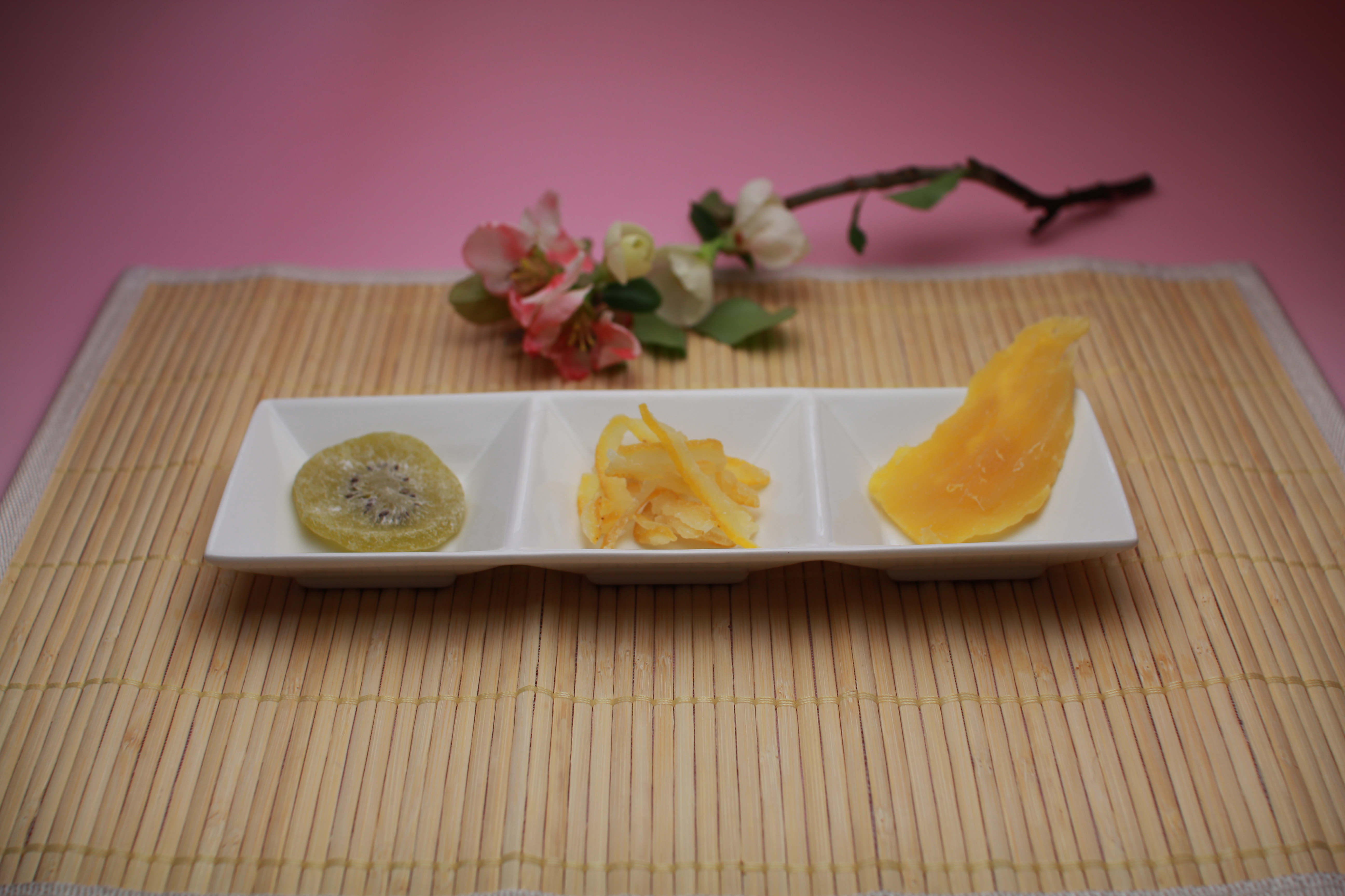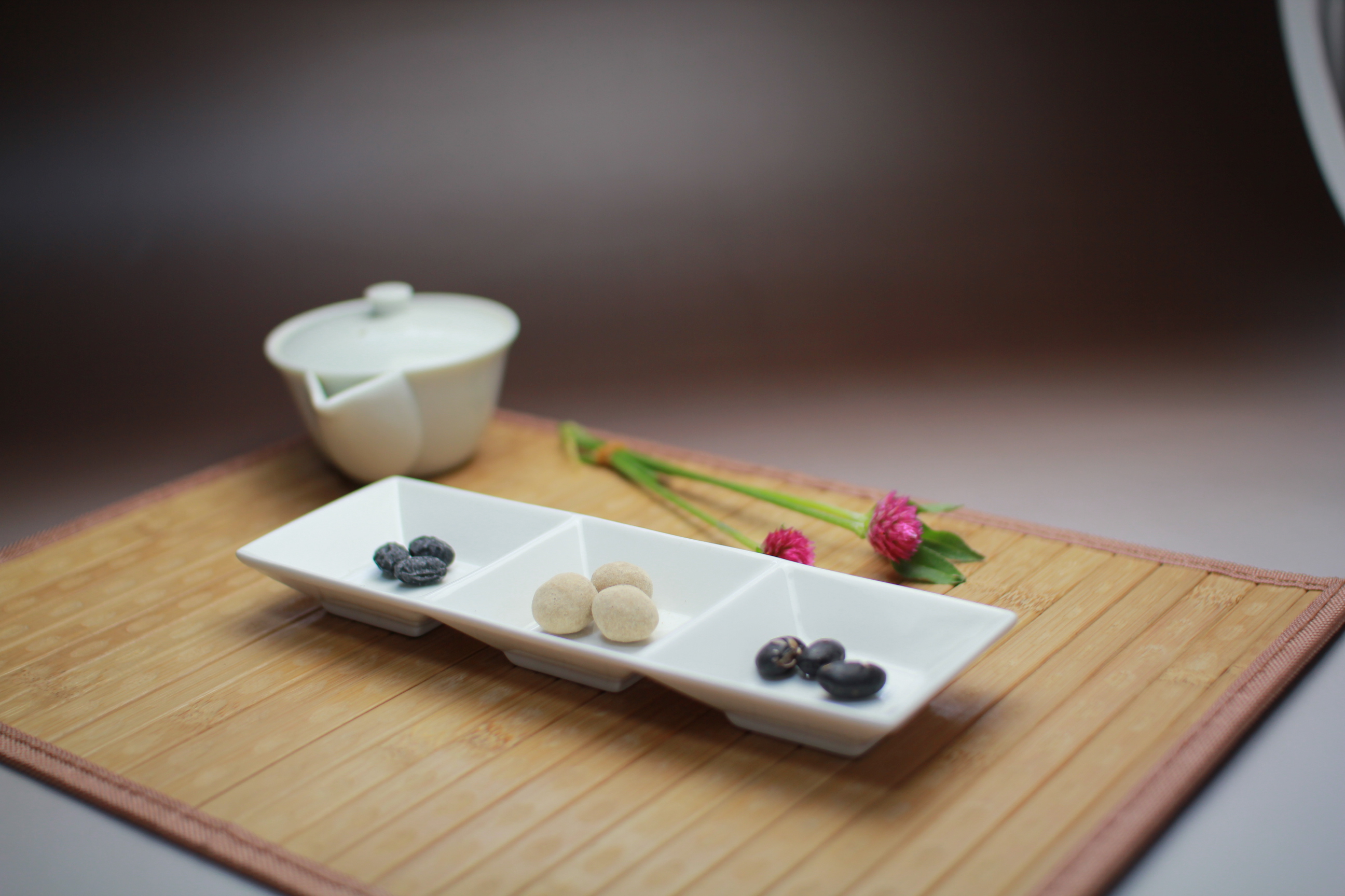 | でっちようかん あっさりとした甘みの羊羹におぶぶカフェ秘伝の粉でデコレーション。 | 丹波豆三種盛り 丹波大粒黒豆に三通りの味付けでご提供 | ドライフルーツ三種盛り 厳選に厳選を重ねたお茶によく合う。究極の三品。 | 気まぐれ 三種盛り その時のオススメ盛り合わせ。 | |