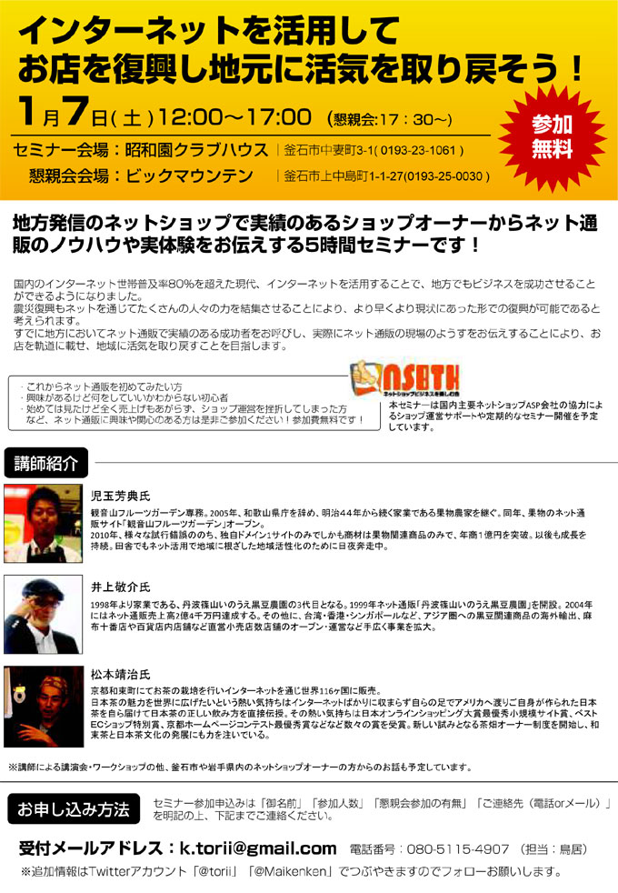 すでに地方においてネット通販で実績のある成功者をお呼びし、実際にネット通販の現場のようすをお伝えすることにより、お店を軌道に載せ、地域に活気を取り戻すことを目指します。