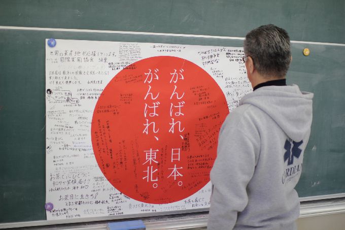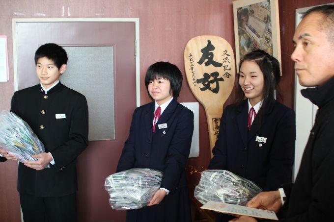 この日は、京都・和束の小・中学生に、このお茶キャラバン出発前に、気仙沼大島の小・中学生宛てに書いてもらったメッセージと中学生が育てて、収穫した宇治和束茶を届けします。