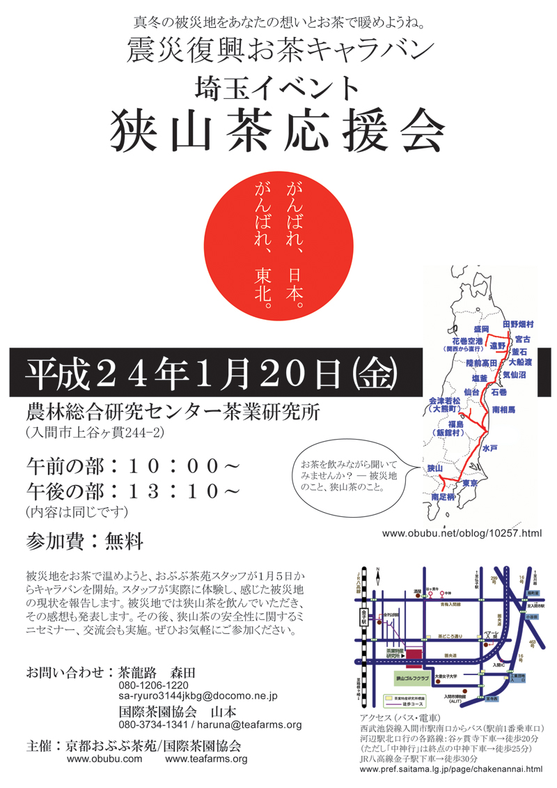 イベントに先駆けて、狭山茶を今回のお茶キャラバンのために用意し、東北の被災各地で飲んでいただき、狭山でのイベントまでにご感想を集めます。