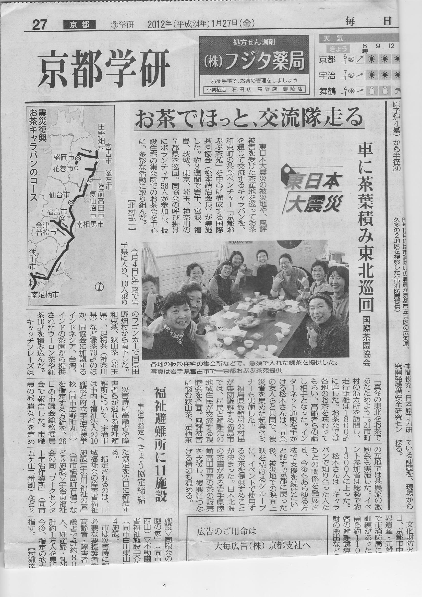 毎日新聞さまに国際茶園協会及びおぶぶ企画「震災復興お茶キャラバン」についてご掲載いただきました。