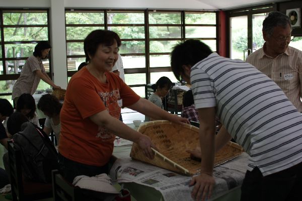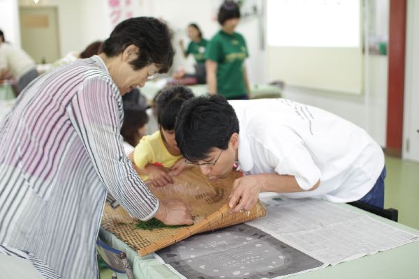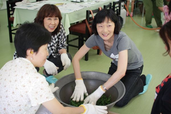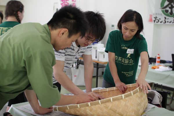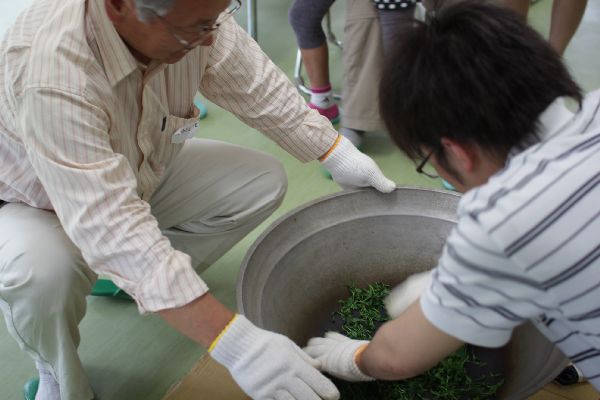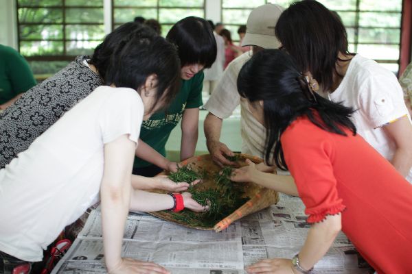 手もみ製茶体験では、グループに分かれて共同作業!