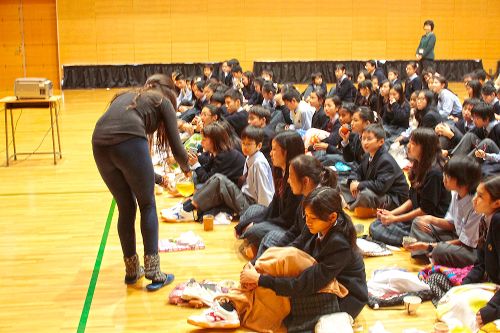 インターン生のジェニーとテイラーと一緒に13才の1年生、約80名と18才の6年生約20名を対象にそれぞれ50分の授業をさせていただきました。