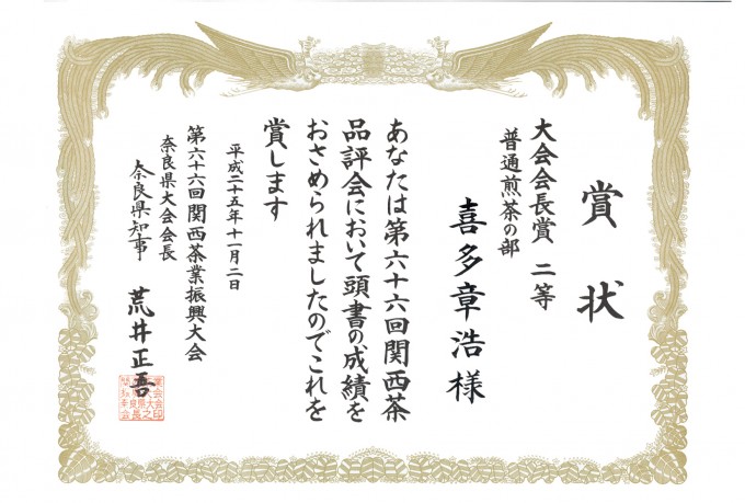 第六十六回関西茶業振興大会にて大会会長賞2等(普通煎茶の部)をいただきました。