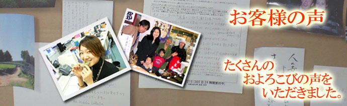 | ご注文いただいたお客様から、ご感想をた~くさんいただいております!! ありがとうございます! 皆さまからいただくご感想は、僕たちの宝です。僕たちのエネルギー源です!! 皆さまの声をどんどん聞かせてくださいね!! ここにご紹介しておりますのは、いただいたご感想のほんの一部です。 |