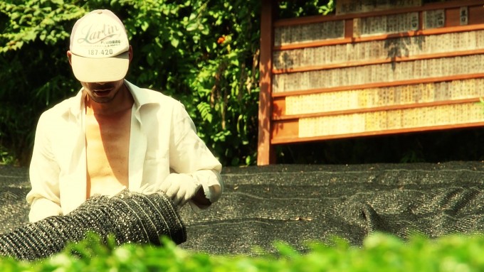碾茶(抹茶)の原料となる茶葉の収穫の様子です。