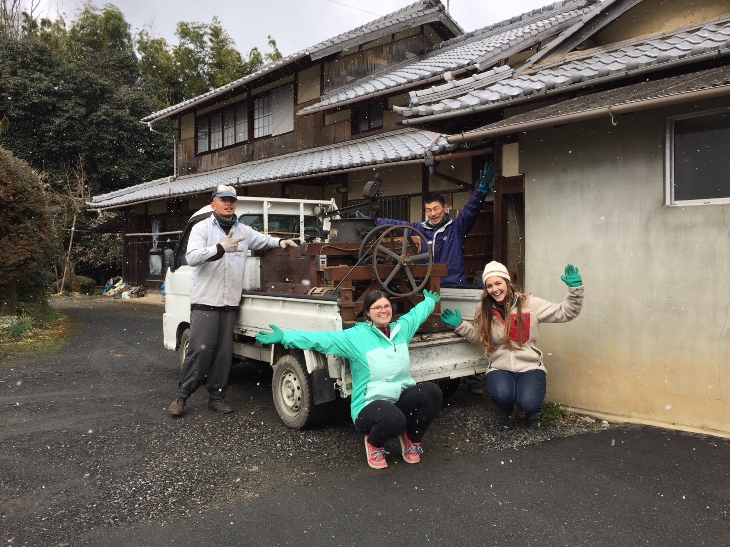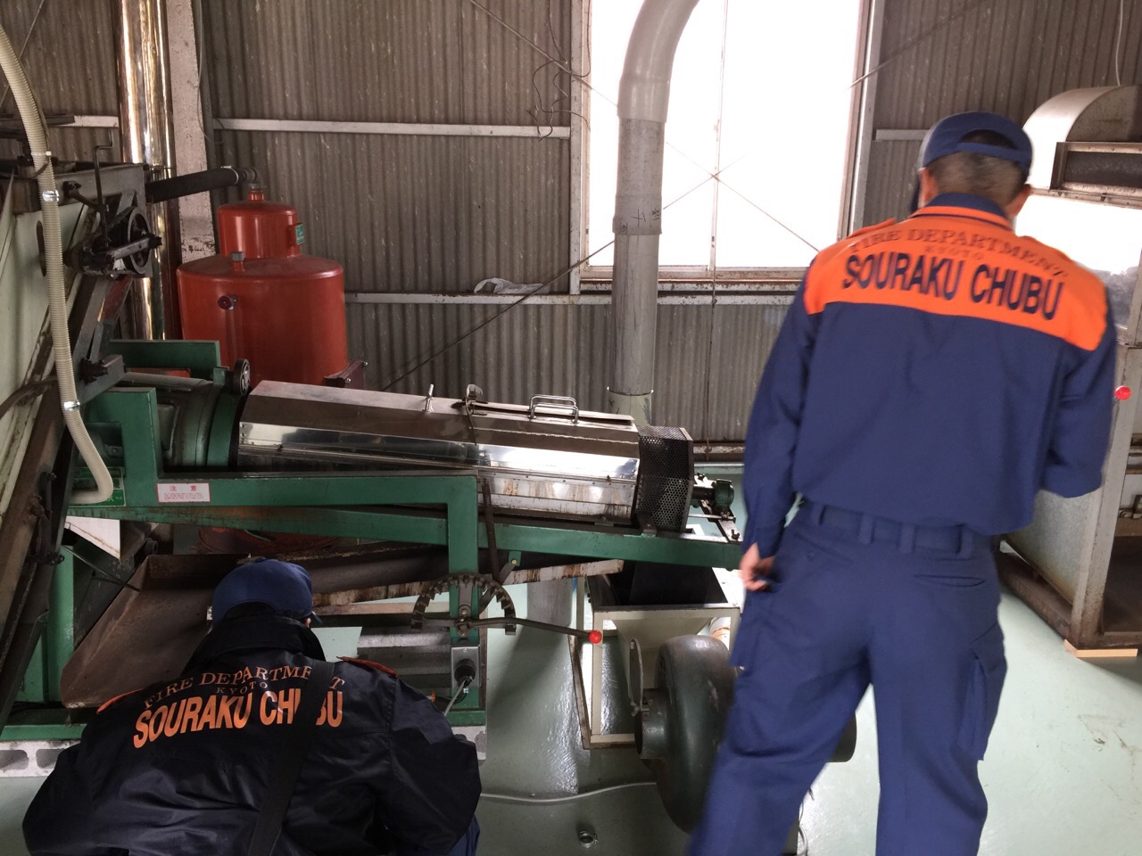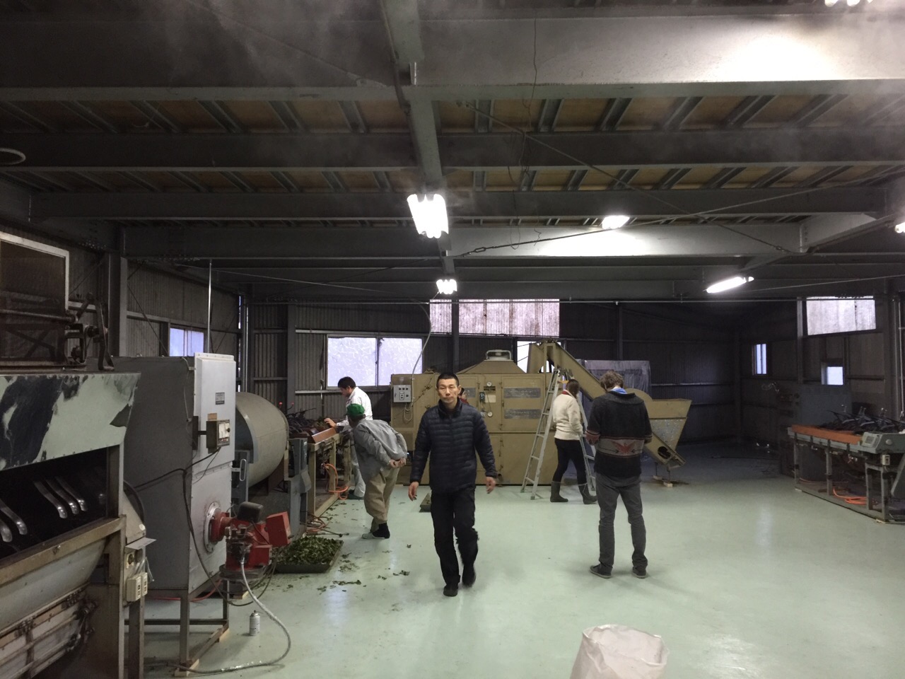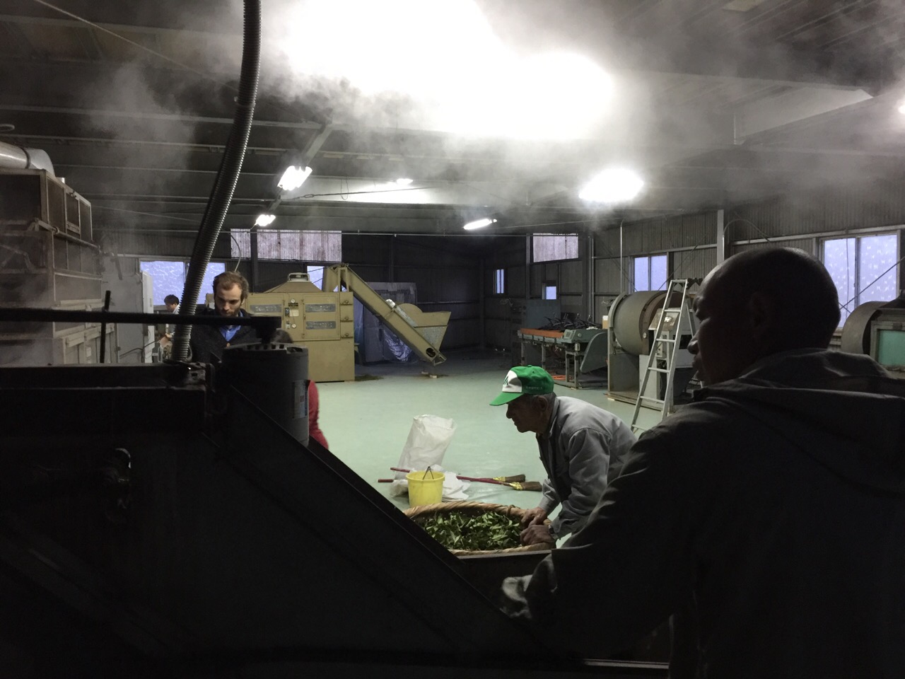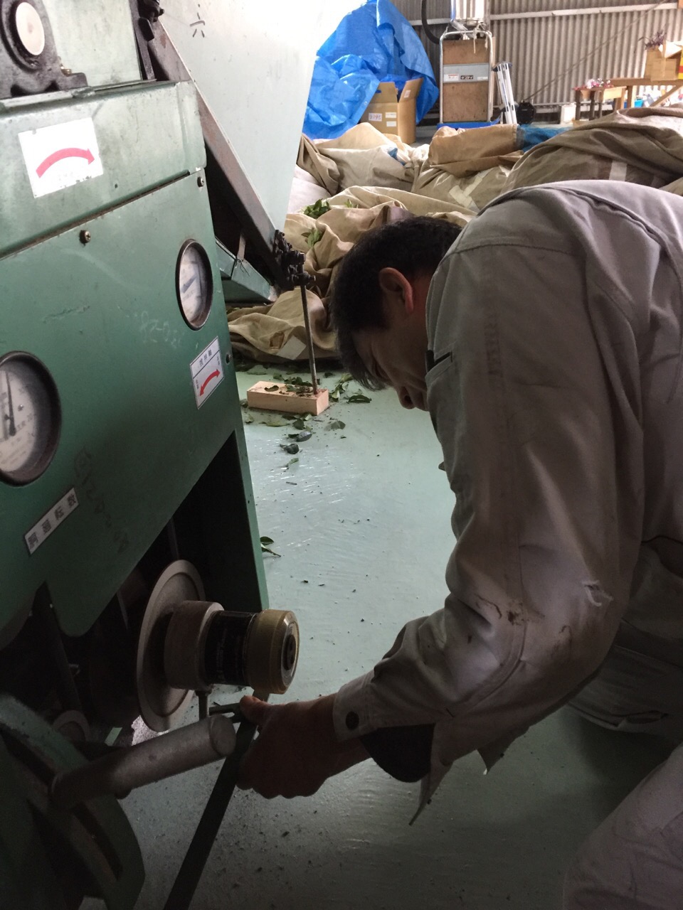 アッキーの向かいの緑帽gentlemanは、この製茶機械の1ラインをお譲りいただいたご近所の茶農家さんで、工場が稼働しているのを観に来ていただきました。