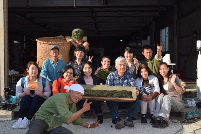できたての新茶を、アッキーがお淹れしみんなで一緒に、味わいます。天気が良かったので、茶工場前でoutdoor tea partyをしました。