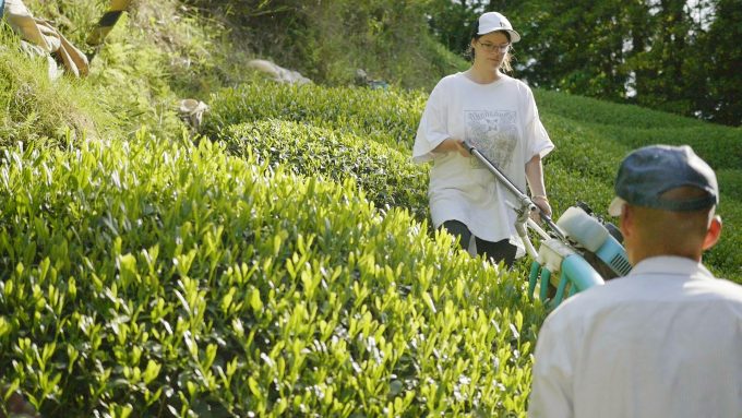 インターン生のアレグラと苑主アッキーがちゃっかりふざけながら真面目に茶刈(ちゃっかり)りしております!
