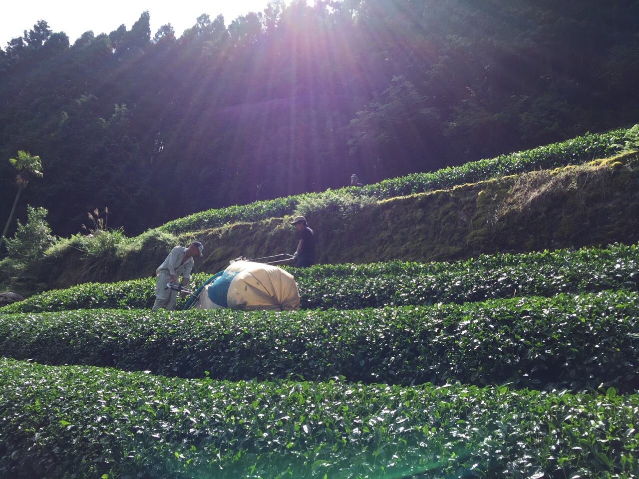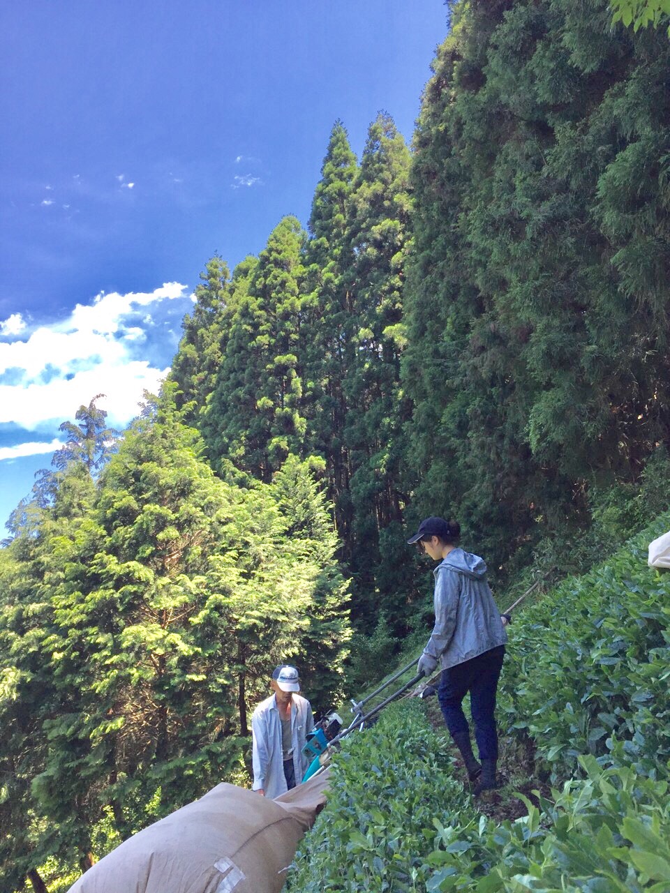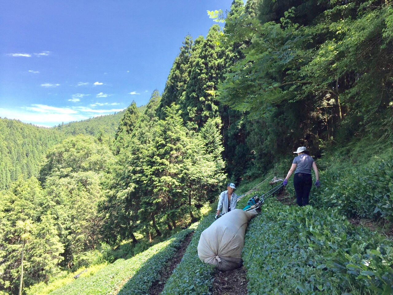 真ん中の小さな黒い点は、帽子をかぶったインターン生Moeちゃんの頭なのですが、下の方に見える道まで収穫したお茶が入った茶袋を担いで運んでくれています。