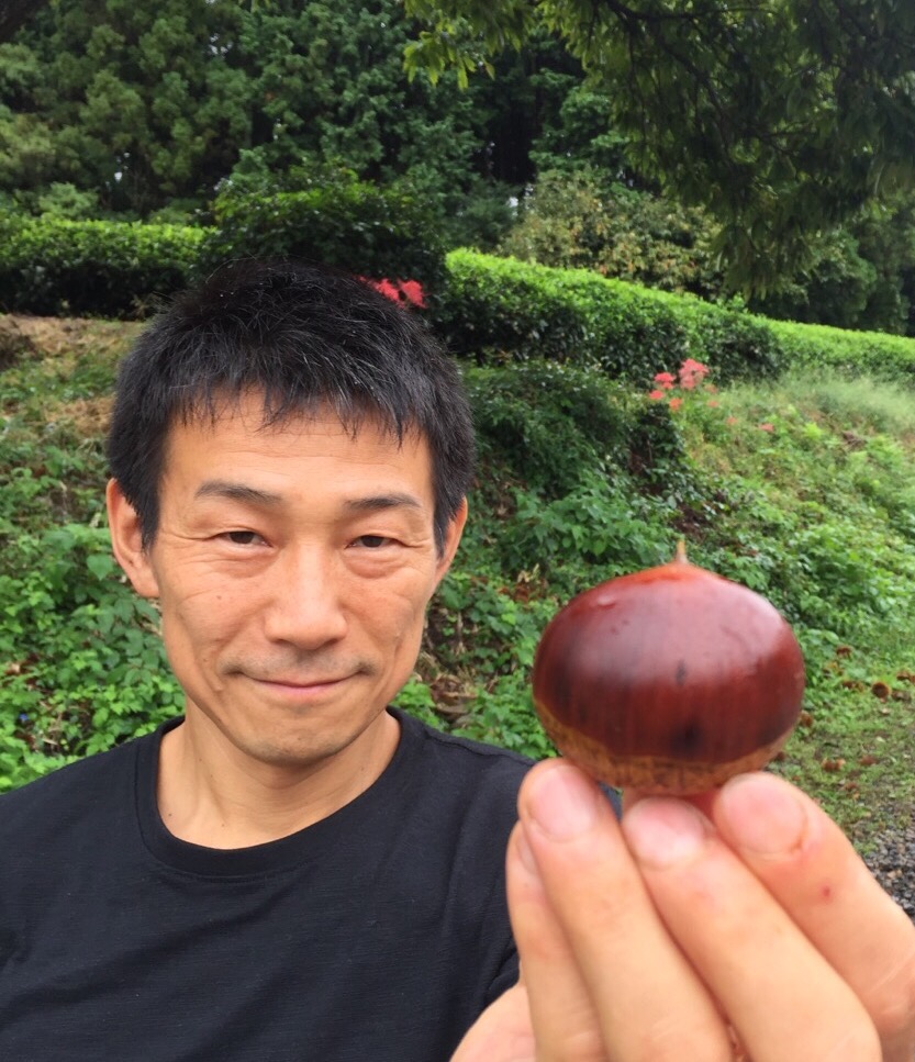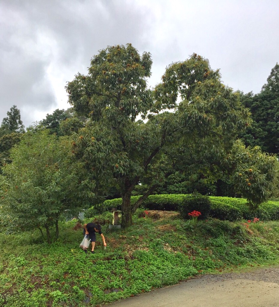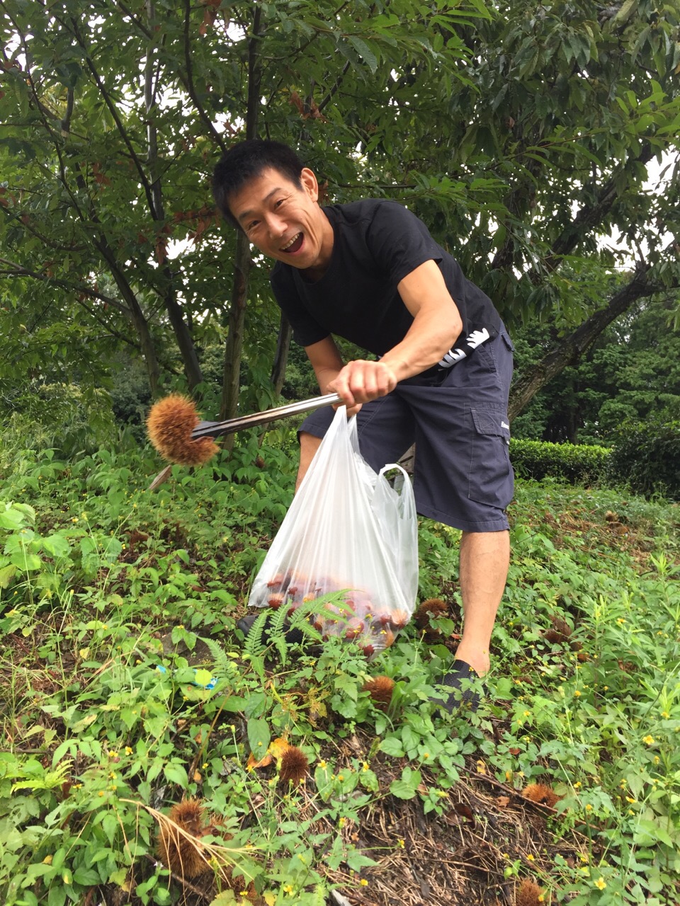 おぶぶ茶苑事務所や茶畑の前に、栗の木があるのですが、おぶ松さんが最近毎朝、栗拾いをしています。
