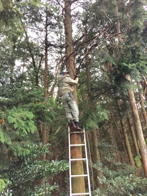 茶畑のすぐ横にある木に登って、茶畑の方に伸びている枝を切っている所だったりします!