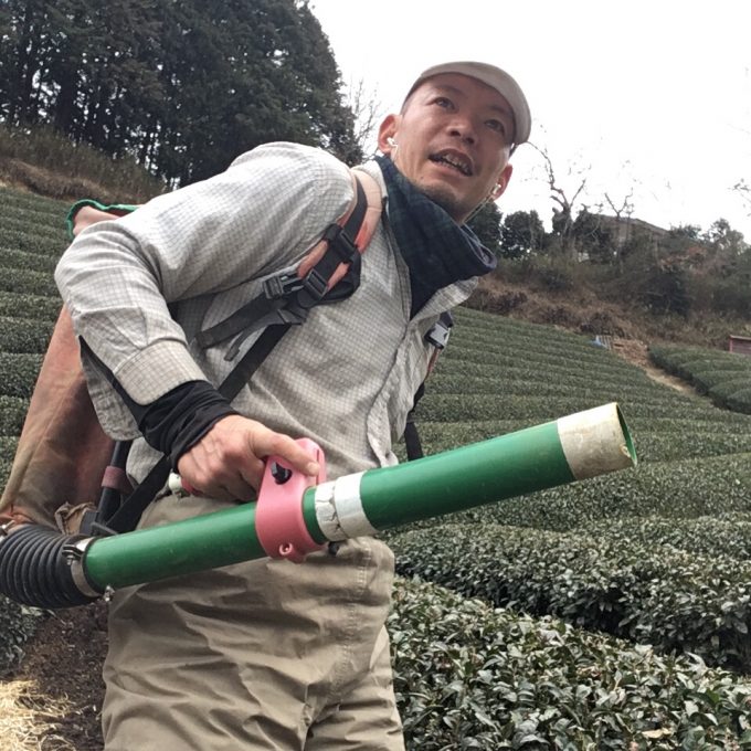 そのサンパーに30キロほど肥料を詰め込みまして、それを背負って茶園の畝間を歩きますねん!