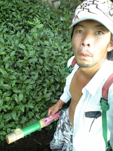 茶苑の間の畝に全面にいきわたるように先っちょを振って散らします。