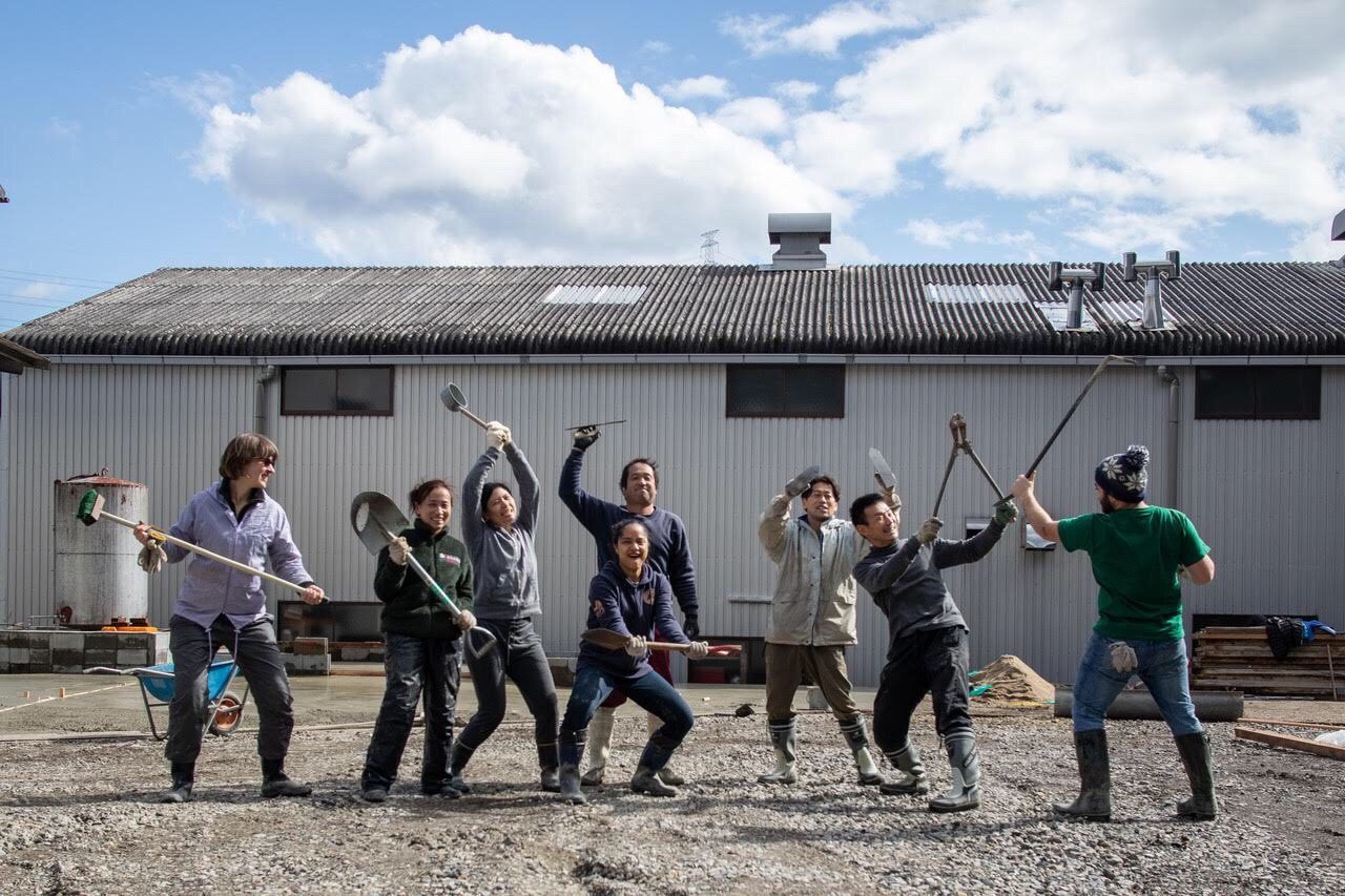 おぶぶ煎茶工場前のコンクリート打設工事の準備をするジョージ