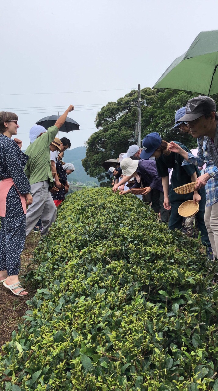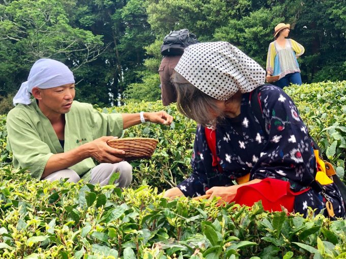 代表のアッキーより、摘み方を説明させてもらった後、みんなで、一芯二葉の夏の新芽を丁寧に手摘みしています。