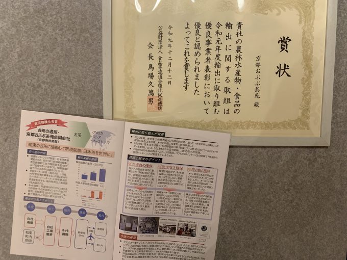 自社HPでのネット海外通販部門を始め、世界中のお茶好きが3ヶ月間日本の茶産地に住み、体験的に学ぶ国際インターンシップ制度、そして世界中どこにいても和束の茶産業を支え、採れたての美味しいお茶が飲める、茶畑オーナー制度など、おぶぶで続けてきた様々な取り組みを評価していただきました。