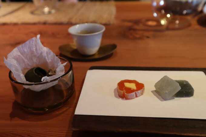 お店の方へみんなで戻り、べにほまれ紅茶と小青柑のお茶をいただきました。この空間の雰囲気がとても素敵で、木の温もりと注がれるお茶の湯気とゆったりとした時間を過ごすことができました。お茶を飲みながら参加されてた方の話を聞いたり、どのようにお茶作りをされているかなどお話を聞いたりととても楽しかったです。