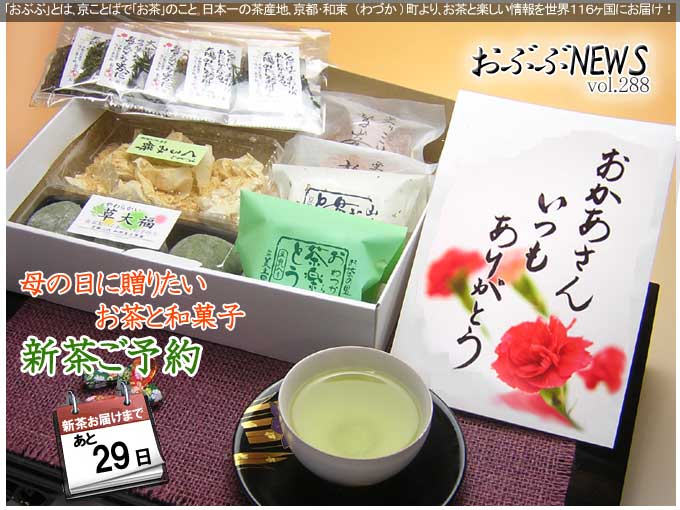 メルマガバックナンバー【おぶぶNEWS】2009 年 5 月 13 日5/13 新茶お届け開始! メルマガバックナンバー【おぶぶNEWS】2009 年 5 月 2 日5/2 本日、八十八夜。 メルマガバックナンバー【おぶぶNEWS】2009 年 4 月 28 日4/28 三連覇!そして、まだ間にあう母の日。 メルマガバックナンバー【おぶぶNEWS】2009 年 4 月 20 日4/20 母の日に贈る言葉