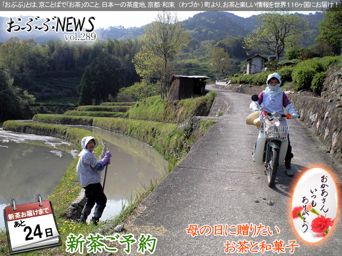 メルマガバックナンバー【おぶぶNEWS】2009 年 5 月 13 日5/13 新茶お届け開始! メルマガバックナンバー【おぶぶNEWS】2009 年 5 月 2 日5/2 本日、八十八夜。 メルマガバックナンバー【おぶぶNEWS】2009 年 4 月 28 日4/28 三連覇!そして、まだ間にあう母の日。 メルマガバックナンバー【おぶぶNEWS】2009 年 4 月 20 日4/20 母の日に贈る言葉