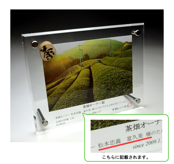 茶畑オーナー証には、お父様のお名前と、贈り主様であるあなたのお名前が記載されます。 >拡大写真をみる