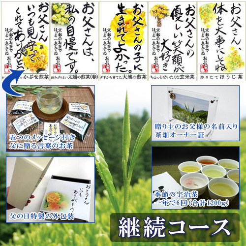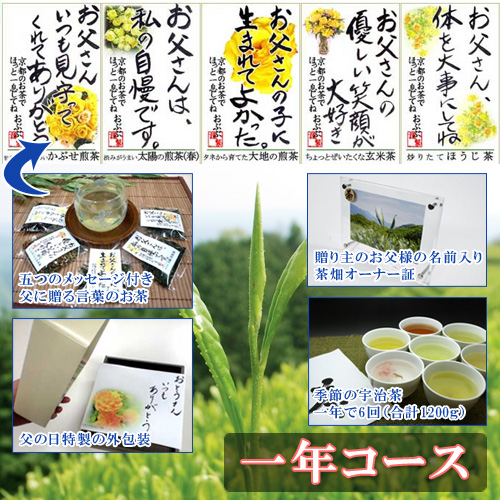 継続的な茶畑オーナー権と父の日限定の五種類のメッセージ付『言葉のお茶』のセット。ちょっとしたギフトを継続的にお父さんに贈りたい方にオススメ。 父の日当日にギフトが届くほか、その後、継続的に年6回(七月中旬、九月下旬、十一月、お正月、三月、五月下旬)に旬の宇治茶が届きます。