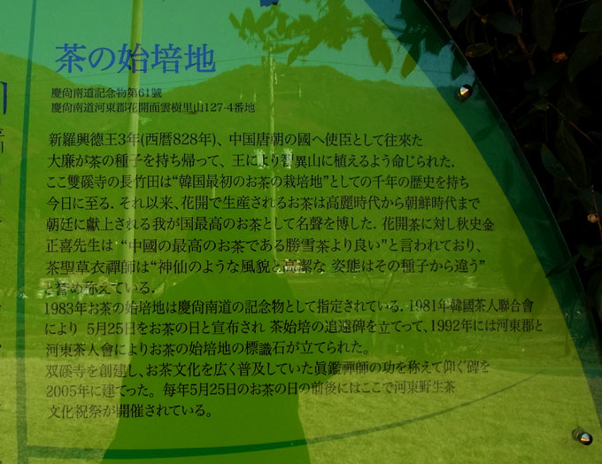 韓国のお茶の始培地の石碑に書かれた説明文(日本語)