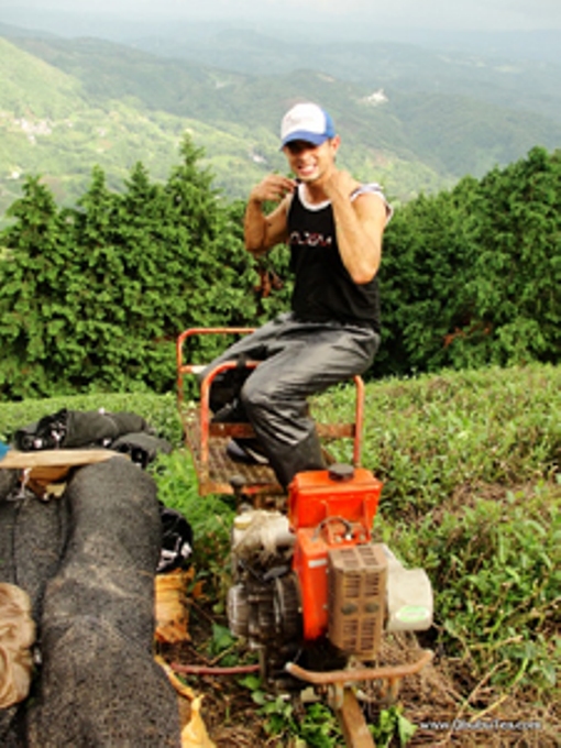 茶畑にあるモノレール(急斜面の茶畑で茶葉を運搬するためのもの)に乗ってはしゃいでます。
