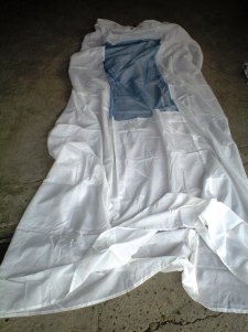 最初なんか布団カバーみたいな感じのやつの、上部はゴムが通してあって、下の部分は大きな穴開いてます。