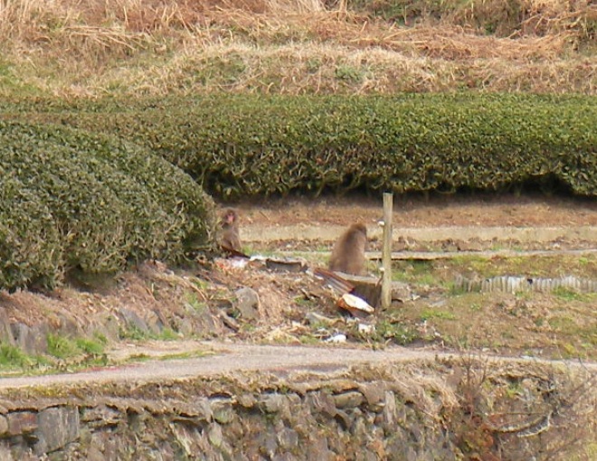 和束町では、日常的に猿の姿をよく見かけます。歩いていてなにげなく見ると橋の欄干に家族仲良く並んで座っているなんていうのはざら。農家の谷さんによれば「稲刈り前くらいの時期になったら、田んぼにずらーっと猿並んで、手で上手に稲しごいて食べとるでー。」なんてことも。一見ほほえましくもありますが、田畑では猿による被害という側面も大きいのです。