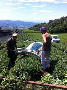 2番茶最後のお茶刈りです~。この時期はカンカン照りの中での作業ですが、お茶の生命力を感じながら暑さに負けず、熱さ(情熱)を持ってお茶刈りをしています。