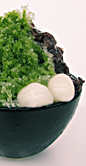 雪のように削った氷の上に「抹茶みつ」「自家製あんこ」「白玉」「ミルク」を絡めていただけます。